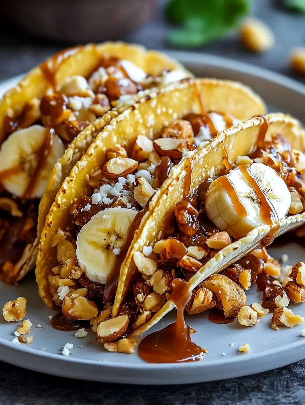 So next time you crave something unique, skip the regular cake or pudding—and indulge in the delightful crunch and gooey sweetness of Caramel Banana Nuts Tacos
