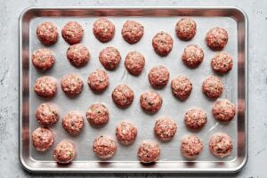 - Mix onions, bread crumbs, Parmesan cheese, and ground beef together in a bowl. Roll mixture into even-sized meatballs, about 1 inch in diameter; place in a baking pan. Bake in the preheated oven until beef is no longer pink, 15 to 20 minutes. Reduce the oven temperature to 350 degrees F (175 degrees C).